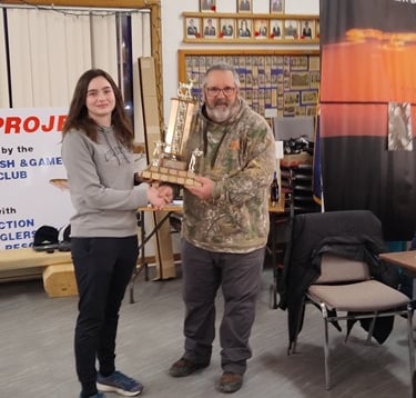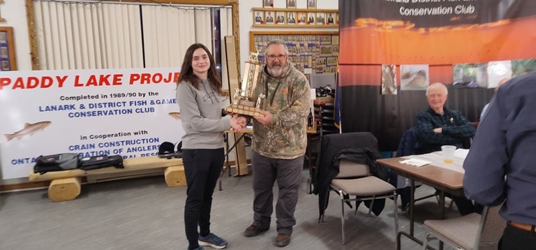 The Lanark & District Fish & Game Conservation Club held their Success-A-Field Awards & Wild Game Supper on Saturday March 25, 2023 at the Royal Canadian Legion in Lanark. A very enjoyable evening was had by the over 40 attendees. Long time member Ernie McDougall was presented with the Sports Person of the Year award by Club President Gordie Morrice, picture attached. Bob Emery received the Wild Turkey Trophy; however, Bob was unable to attend. Wendy Tye-LaRocque was presented with the Big Buck Trophy. Len Dickinson received Honorable Mention for harvesting a record bear. Hannah LaRocque, aged 13 and Sandra LaRocque aged 16 received Honorable Mention for both harvesting their first deer on the first day of the 2022 Deer Season! Picture of Hannah and Wendy attached. Sandra was unable to attend.
